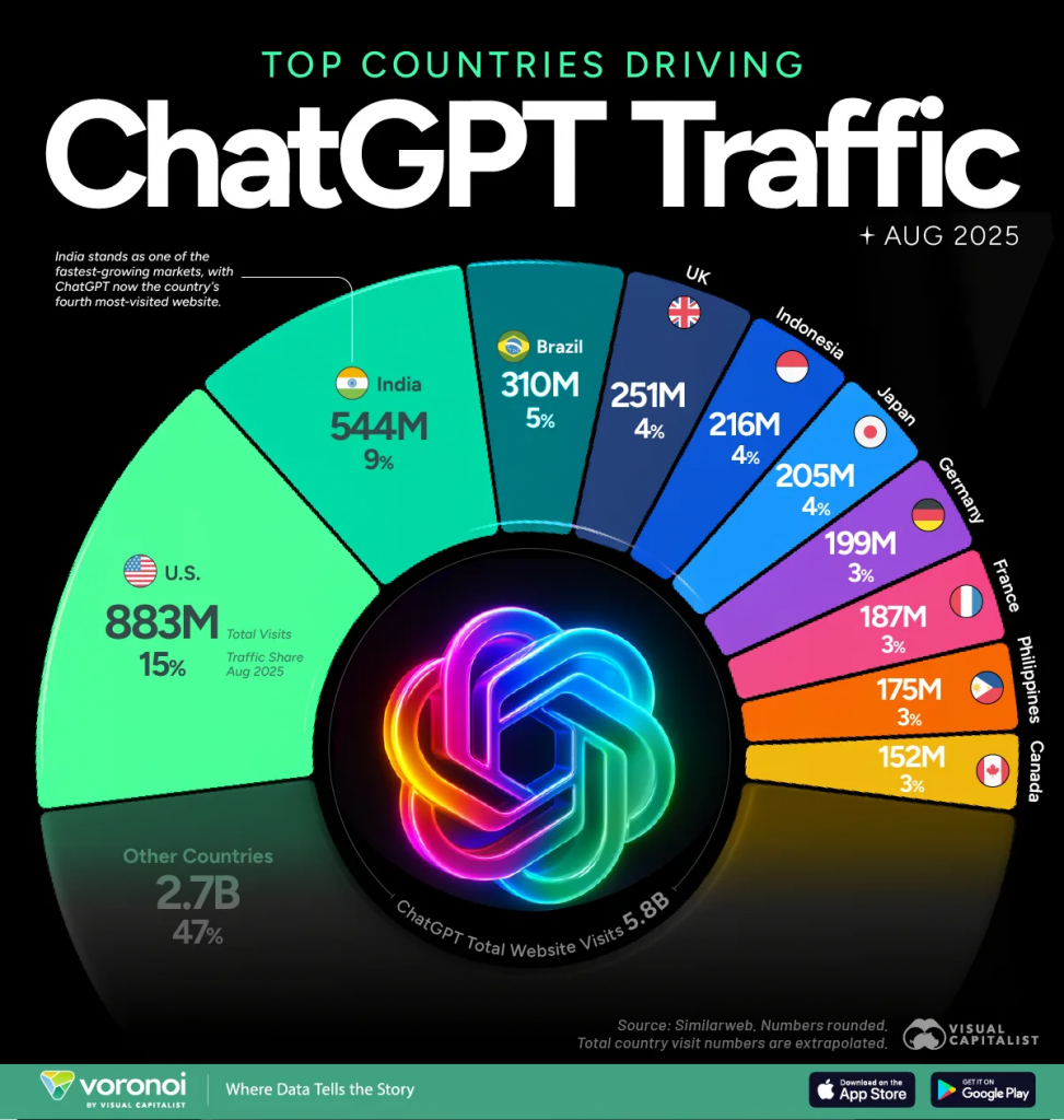 Avec plus de 46,59 milliards de visites annuelles, ChatGPT est de loin le chatbot IA le plus utilisé dans le monde. Mais voyons voir ce qu’il en est par répartition par pays en termes de trafic (MAJ août 2025).